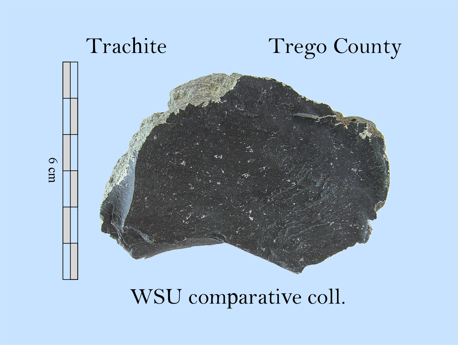 A coarse black stone found in lag gravels from the Ogallala formation and used to make chipped stone artifacts. It is opaque, grainy and black in color. Trachite cobbles develop a thin pale gray patina (SS16). Trachite is common in the vicinity of Council Bluff Reservoir.